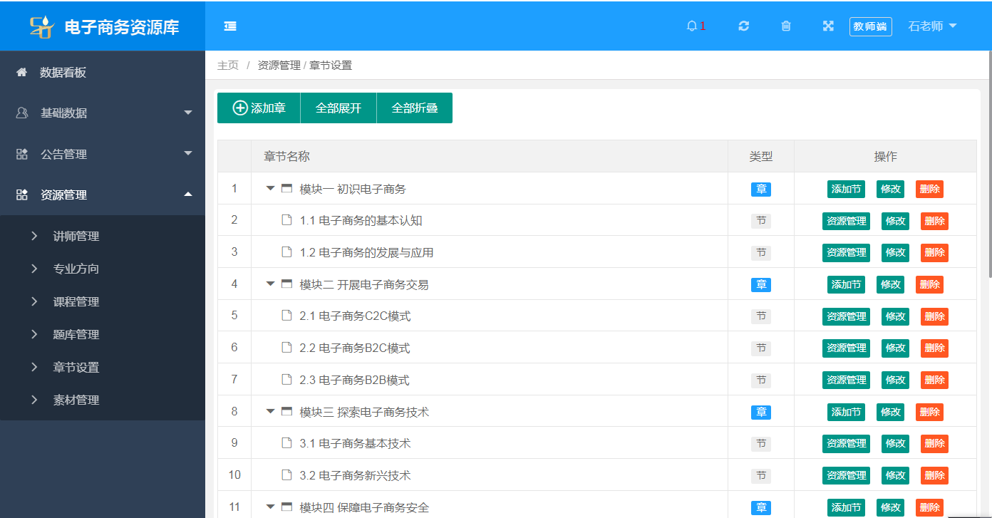 教(jiao)師端(duan)的基礎數據包括數據看板(ban),基礎數據,公告管理(li)(li),資源管理(li)(li)。數據統計(ji)包括班級統計(ji),學生(sheng)統計(ji),專(zhuan)業方向,課程統計(ji),講師統計(ji),素材統計(ji),報表統計(ji)等。