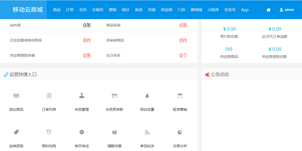 6、后臺支持系統包含商(shang)品(pin)管(guan)理(li)、訂單管(guan)理(li)、會員(yuan)管(guan)理(li)、分(fen)銷(xiao)員(yuan)管(guan)理(li)、營銷(xiao)中心、統計分(fen)析、基本設置、頁面管(guan)理(li)、供(gong)應(ying)商(shang)管(guan)理(li)、門店管(guan)理(li)、微商(shang)城(cheng)管(guan)理(li)、小程序管(guan)理(li)、生活(huo)號(hao)設置等模塊(kuai)。