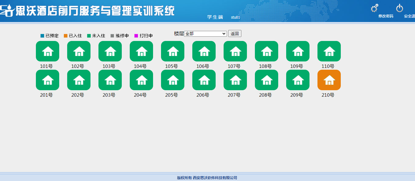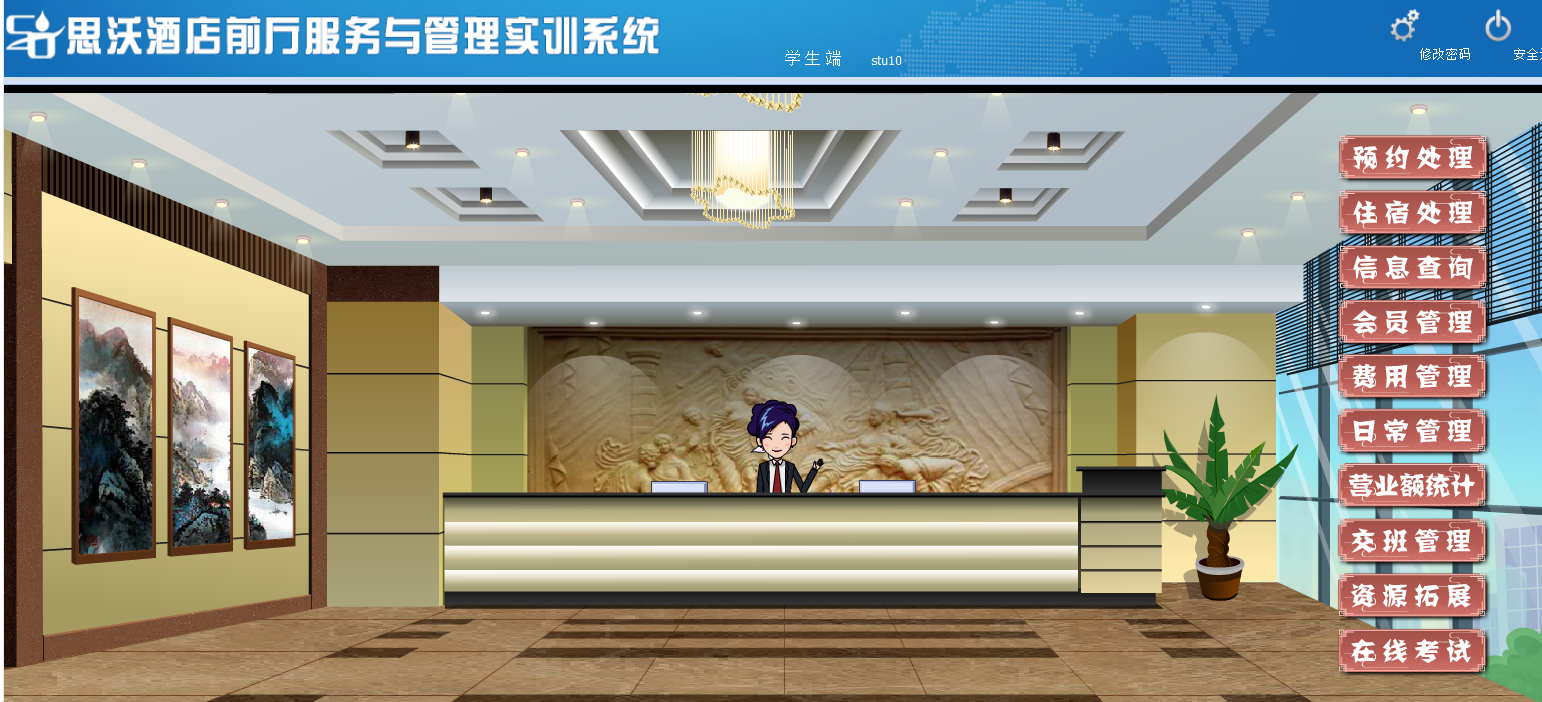 思沃(wo)酒店前(qian)廳(ting)服務(wu)(wu)與管(guan)理(li)模擬實(shi)訓(xun)平(ping)臺(tai)(tai)系統以(yi)學(xue)(xue)生(sheng)酒店前(qian)廳(ting)工作崗位任(ren)務(wu)(wu)為基礎(chu),以(yi)案例(li)動(dong)畫(hua)結合(he)的模式(shi)開(kai)展情景模擬實(shi)訓(xun),學(xue)(xue)生(sheng)可(ke)在該(gai)教學(xue)(xue)軟件(jian)設置的虛擬酒店環境中(zhong),完成預定、入住辦理(li)、續住、退房(fang)、換(huan)房(fang)、會(hui)(hui)員(yuan)管(guan)理(li)、故障報修(xiu)、投訴處理(li)、黑名單(dan)等相關案例(li)任(ren)務(wu)(wu)的操(cao)作。該(gai)教學(xue)(xue)平(ping)臺(tai)(tai)軟件(jian)可(ke)以(yi)逼真的體驗(yan)實(shi)際酒店前(qian)廳(ting)工作的過程。本公司為了更好滿足高校的教學(xue)(xue)需求,也會(hui)(hui)根據高校的需求提供(gong)酒店管(guan)理(li)實(shi)訓(xun)室(shi)解決方案,