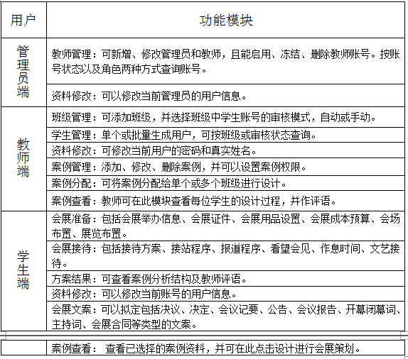 根據每個案例信息,系統(tong)細分(fen)會(hui)(hui)(hui)(hui)展(zhan)(zhan)(zhan)策劃過程,將展(zhan)(zhan)(zhan)覽會(hui)(hui)(hui)(hui)名稱、活(huo)動背(bei)景、活(huo)動目(mu)的(de)意義、會(hui)(hui)(hui)(hui)展(zhan)(zhan)(zhan)具體展(zhan)(zhan)(zhan)示(shi)部(bu)分(fen)以及(ji)或中中需要注意的(de)問題融入到整個實訓系統(tong)中。會(hui)(hui)(hui)(hui)展(zhan)(zhan)(zhan)策劃軟件將突出會(hui)(hui)(hui)(hui)展(zhan)(zhan)(zhan)舉辦信息、會(hui)(hui)(hui)(hui)展(zhan)(zhan)(zhan)證件、會(hui)(hui)(hui)(hui)展(zhan)(zhan)(zhan)用(yong)品設置(zhi)、會(hui)(hui)(hui)(hui)展(zhan)(zhan)(zhan)成本預算、會(hui)(hui)(hui)(hui)場布置(zhi)、展(zhan)(zhan)(zhan)覽布置(zhi)、接(jie)(jie)待(dai)方案、接(jie)(jie)站程序(xu)、報到程序(xu)、看(kan)望會(hui)(hui)(hui)(hui)見(jian)、作息時間(jian)、文藝接(jie)(jie)待(dai)等項目(mu)。