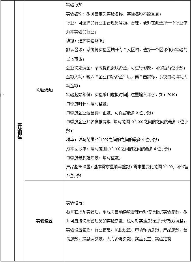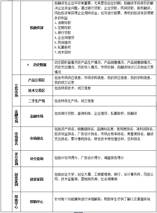 4、企(qi)(qi)業(ye)(ye)投融(rong)(rong)資(zi)管理:系(xi)統(tong)必須含(han)有(you)投融(rong)(rong)資(zi)模塊(kuai),了解(jie)操作企(qi)(qi)業(ye)(ye)的基本投資(zi)和融(rong)(rong)資(zi)手段,模塊(kuai)包括:銀行存(cun)款、銀行貸款、企(qi)(qi)業(ye)(ye)間(jian)借貸、民間(jian)借貸、私幕股權(quan)。另(ling)外還含(han)有(you)風(feng)(feng)(feng)險(xian)投資(zi)模塊(kuai),在審核計劃(hua)書后做出(chu)評價(jia)和評分,由教師設(she)置(zhi)是否給(gei)予(yu)風(feng)(feng)(feng)險(xian)投資(zi),以及金(jin)額。設(she)置(zhi)后系(xi)統(tong)自動給(gei)相應企(qi)(qi)業(ye)(ye)發送(song)反饋(kui)信息,接受并給(gei)予(yu)風(feng)(feng)(feng)投的企(qi)(qi)業(ye)(ye)前來簽訂風(feng)(feng)(feng)投協議領取風(feng)(feng)(feng)投資(zi)金(jin)