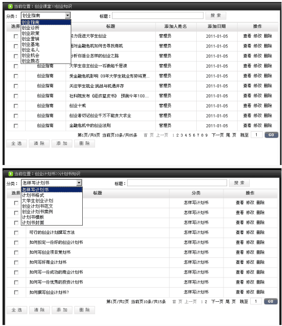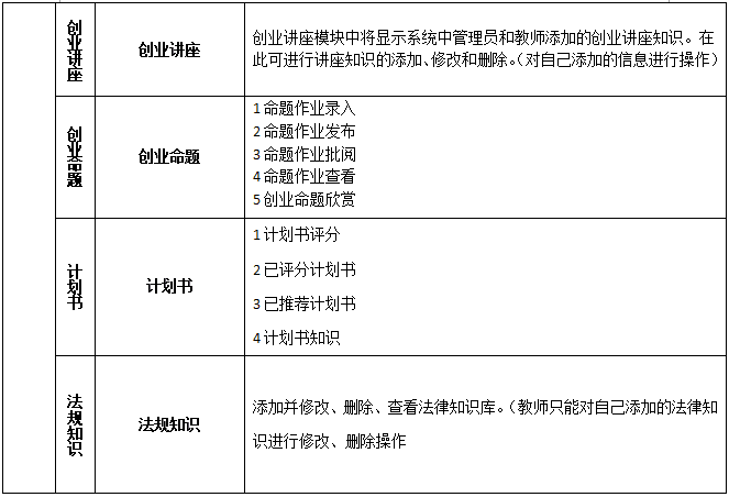 2、包含(han)創(chuang)(chuang)(chuang)(chuang)業(ye)(ye)(ye)(ye)理(li)論(lun)知識的(de)學習和創(chuang)(chuang)(chuang)(chuang)業(ye)(ye)(ye)(ye)實戰(zhan)訓練。創(chuang)(chuang)(chuang)(chuang)業(ye)(ye)(ye)(ye)理(li)論(lun)知識包括測評系統、創(chuang)(chuang)(chuang)(chuang)業(ye)(ye)(ye)(ye)課堂(tang)、創(chuang)(chuang)(chuang)(chuang)業(ye)(ye)(ye)(ye)講談、創(chuang)(chuang)(chuang)(chuang)業(ye)(ye)(ye)(ye)命(ming)題、創(chuang)(chuang)(chuang)(chuang)業(ye)(ye)(ye)(ye)計劃(hua)書、法規知識、網上創(chuang)(chuang)(chuang)(chuang)業(ye)(ye)(ye)(ye)、創(chuang)(chuang)(chuang)(chuang)業(ye)(ye)(ye)(ye)準備、創(chuang)(chuang)(chuang)(chuang)業(ye)(ye)(ye)(ye)論(lun)壇。創(chuang)(chuang)(chuang)(chuang)業(ye)(ye)(ye)(ye)實戰(zhan)訓練包含(han)選擇(ze)行(xing)業(ye)(ye)(ye)(ye)、注冊公(gong)司、人員招(zhao)聘、產品戰(zhan)略策劃(hua)、產品生產、渠道銷(xiao)售、促銷(xiao)、備貨運送等內(nei)容(rong)。