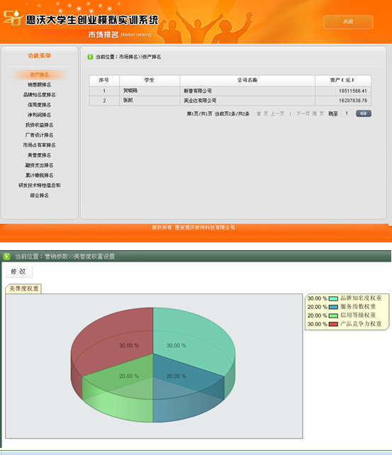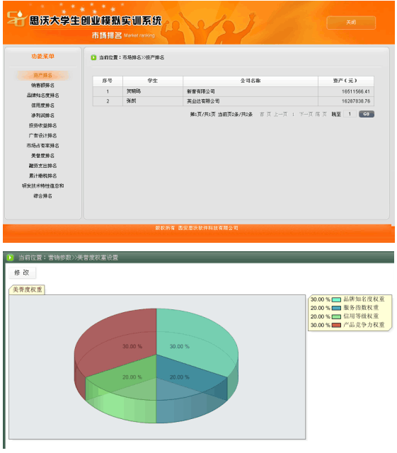 5、系(xi)統具有自(zi)動(dong)(dong)計分(fen)和手(shou)動(dong)(dong)評分(fen)功能。自(zi)動(dong)(dong)計分(fen)以(yi)各方面(mian)排名(ming)的(de)形式,包括資金(jin)排名(ming)、銷售排名(ming)、知名(ming)度排名(ming)、利潤排名(ming)、投資收(shou)益排名(ming)、廣告(gao)設計排名(ming)、市(shi)場占有率(lv)排名(ming)、美(mei)譽(yu)度排名(ming)、投融資收(shou)益排名(ming)、累計繳稅排名(ming)、綜合排名(ming)等。教(jiao)師可以(yi)批閱學生(sheng)所(suo)提交(jiao)的(de)計劃書、廣告(gao)設計、市(shi)場調查(cha)分(fen)析、公司制度等。