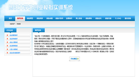 思沃大學(xue)生(sheng)創(chuang)(chuang)(chuang)(chuang)業(ye)(ye)模(mo)擬(ni)(ni)實(shi)(shi)訓平臺系(xi)統(tong)從(cong)大學(xue)生(sheng)創(chuang)(chuang)(chuang)(chuang)業(ye)(ye)的(de)(de)(de)(de)(de)現狀(zhuang)分(fen)(fen)析,將(jiang)創(chuang)(chuang)(chuang)(chuang)業(ye)(ye)教育的(de)(de)(de)(de)(de)內(nei)容以及因素滲(shen)透在專業(ye)(ye)實(shi)(shi)踐(jian)教學(xue)中,并根據創(chuang)(chuang)(chuang)(chuang)業(ye)(ye)教育的(de)(de)(de)(de)(de)目標(biao)及內(nei)容設置(zhi)較完善的(de)(de)(de)(de)(de)創(chuang)(chuang)(chuang)(chuang)業(ye)(ye)實(shi)(shi)踐(jian)體系(xi)。軟件模(mo)擬(ni)(ni)交互思想,采(cai)用國際(ji)先進的(de)(de)(de)(de)(de)計算機仿真(zhen)技(ji)術(shu),仿真(zhen)模(mo)擬(ni)(ni)虛擬(ni)(ni)市(shi)場(chang)環(huan)境、市(shi)場(chang)調(diao)(diao)查以及整個(ge)市(shi)場(chang)競爭結(jie)構。學(xue)生(sheng)通(tong)過(guo)(guo)軟件學(xue)習創(chuang)(chuang)(chuang)(chuang)業(ye)(ye)心理學(xue)、創(chuang)(chuang)(chuang)(chuang)業(ye)(ye)講堂、網(wang)上創(chuang)(chuang)(chuang)(chuang)業(ye)(ye)、創(chuang)(chuang)(chuang)(chuang)業(ye)(ye)準備等創(chuang)(chuang)(chuang)(chuang)業(ye)(ye)知識,撰寫一(yi)份(fen)創(chuang)(chuang)(chuang)(chuang)業(ye)(ye)計劃書,投入(ru)到創(chuang)(chuang)(chuang)(chuang)業(ye)(ye)實(shi)(shi)戰中。創(chuang)(chuang)(chuang)(chuang)業(ye)(ye)實(shi)(shi)戰分(fen)(fen)為(wei)公(gong)(gong)司注(zhu)冊(ce)和實(shi)(shi)戰運營(ying)。公(gong)(gong)司注(zhu)冊(ce)采(cai)用Flash動畫(hua)模(mo)式,模(mo)擬(ni)(ni)公(gong)(gong)司注(zhu)冊(ce)的(de)(de)(de)(de)(de)整個(ge)流程(cheng)。實(shi)(shi)戰運營(ying)是整個(ge)系(xi)統(tong)的(de)(de)(de)(de)(de)主體,將(jiang)全國分(fen)(fen)為(wei)七個(ge)區(qu)域:東(dong)北(bei)地區(qu)、華北(bei)地區(qu)、西(xi)(xi)北(bei)地區(qu)、華東(dong)地區(qu)、西(xi)(xi)南(nan)地區(qu)、華中地區(qu)、華南(nan)地區(qu)。系(xi)統(tong)模(mo)擬(ni)(ni)公(gong)(gong)司內(nei)部(bu)與外(wai)在市(shi)場(chang)之間(jian)的(de)(de)(de)(de)(de)矛盾(dun),創(chuang)(chuang)(chuang)(chuang)業(ye)(ye)者通(tong)過(guo)(guo)各種調(diao)(diao)查、決策(ce)解決企業(ye)(ye)市(shi)場(chang)運營(ying)過(guo)(guo)程(cheng)中可能遇(yu)到的(de)(de)(de)(de)(de)各種情況。在區(qu)域需求(qiu)飽(bao)和后擴(kuo)大市(shi)場(chang),對(dui)其(qi)中出現的(de)(de)(de)(de)(de)問題和運營(ying)結(jie)果(guo)進行分(fen)(fen)析與評估,培養大學(xue)生(sheng)正(zheng)確的(de)(de)(de)(de)(de)人(ren)生(sheng)觀、價值觀、就業(ye)(ye)觀,提(ti)高(gao)大學(xue)生(sheng)勇(yong)于創(chuang)(chuang)(chuang)(chuang)業(ye)(ye)的(de)(de)(de)(de)(de)精神(shen),讓大學(xue)生(sheng)有良好的(de)(de)(de)(de)(de)創(chuang)(chuang)(chuang)(chuang)業(ye)(ye)意識,增(zeng)強大學(xue)生(sheng)自(zi)主創(chuang)(chuang)(chuang)(chuang)業(ye)(ye)能力。